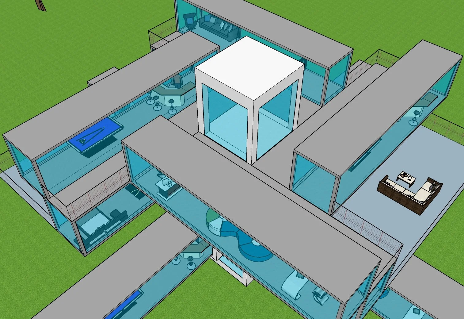 House 11 is the third in a series of houses I designed around a single pillar, however, unlike House 08 and House 09 this design is very complex and implements several new concepts all wrapped around the single pillar. The center pillar acts not only as the backbone of the dwelling incorporating a four-way room-module connector but also incorporates a glass entry and a similarly designed observation tower. The single piler suspends the living spaces above ground and makes the house floodproof. The pillar is anchored underground where other spaces can be built, such as underground parking, a cellar, or a bunker for tornado protection.